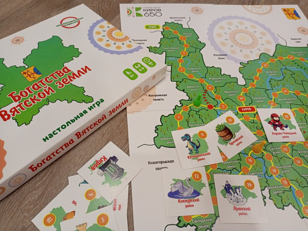 Игра «Богатства земли Вятской» создана к юбилею Кировской области (Вятской земли). Она погружает в историю и традиции региона. Среди особенностей: